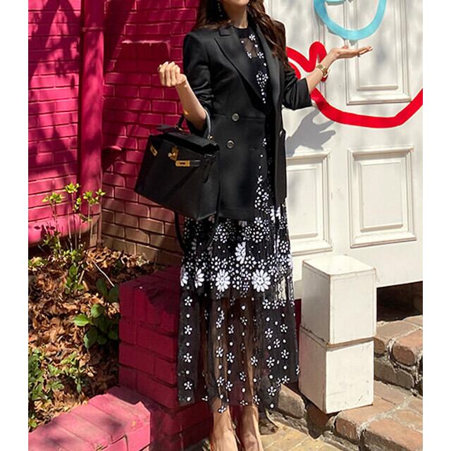 S/M/L/XL レディース パーティードレス ワンピースドレス 刺繍 メッシュ シースルー ウエストマーク ドレス フラワー レース ブラック