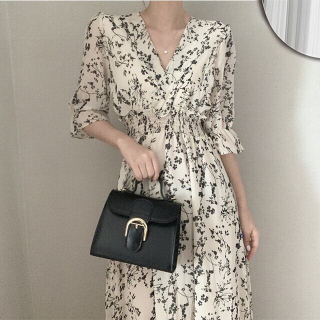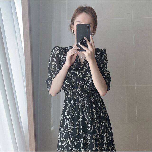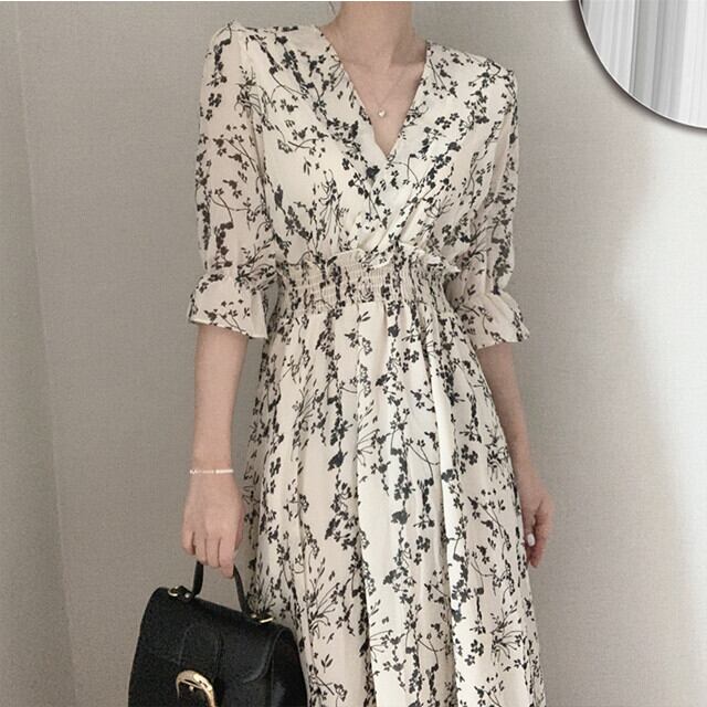 レディース ワンピース シフォン ミモレ丈 膝下 Vネック 半袖 五分袖 パフスリーブ 花柄 小花柄 ホワイト/ブラック
