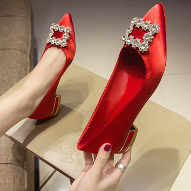 レディース パンプス サテン ポインテッドトゥ スクエアバックル ローヒール ビジュー ピンク/レッド