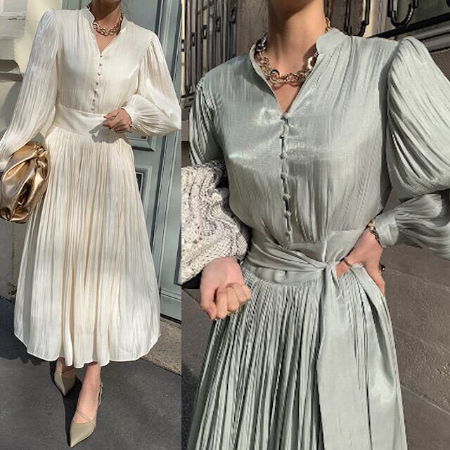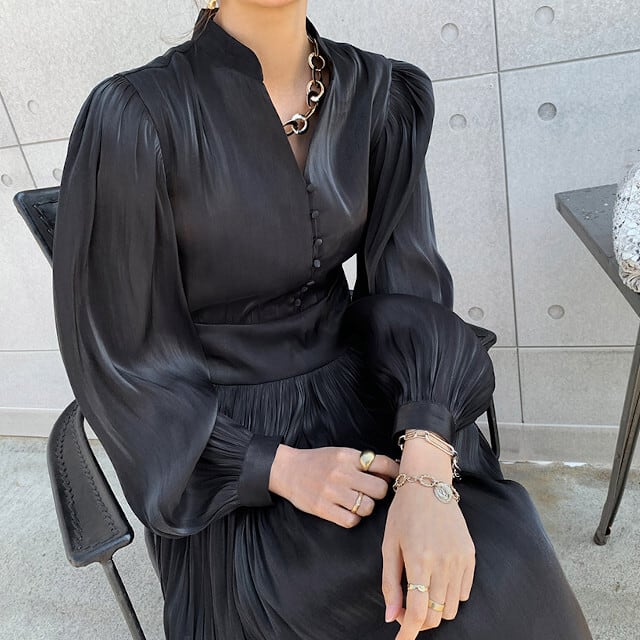 全3色 ライトブルー/ホワイト/ブラック ニュアンスカラー レディース ワンピース 光沢 サテン ボリュームスリーブ 長袖 ミモレ丈 Vネック