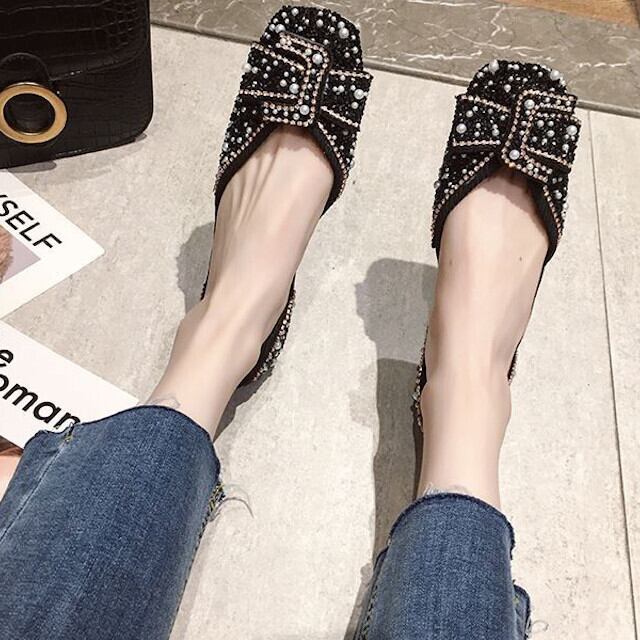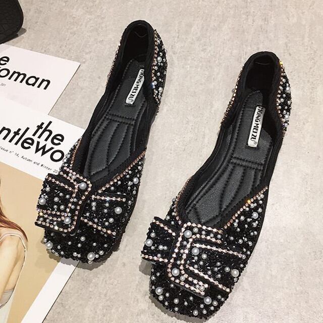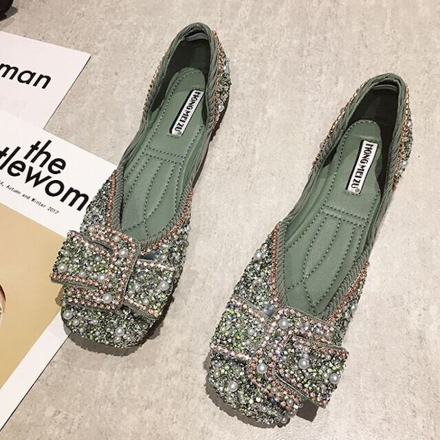 全3色 ブラック/ピンク/グリーン レディース パンプス パール付き ビジュー スクエアトゥ パンプス ぺたんこ