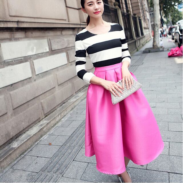 全3色 ブラック/ピンク/ブルー レディース スカート Aライン フレア 大人かわいい ミモレ丈 S/M/L/XL/2XL