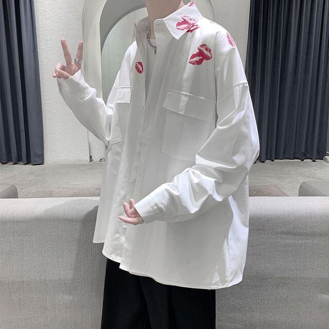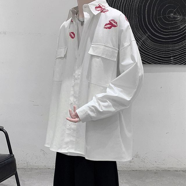 【予約販売】シャツ 長袖 メンズ キスマーク kiss ホワイト ブラック モノトーン シック こなれ感 お洒落 エレガント 韓国 トレンド 春 M/L/XL/2XL