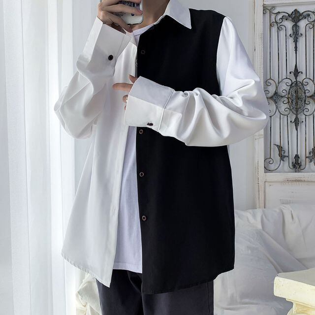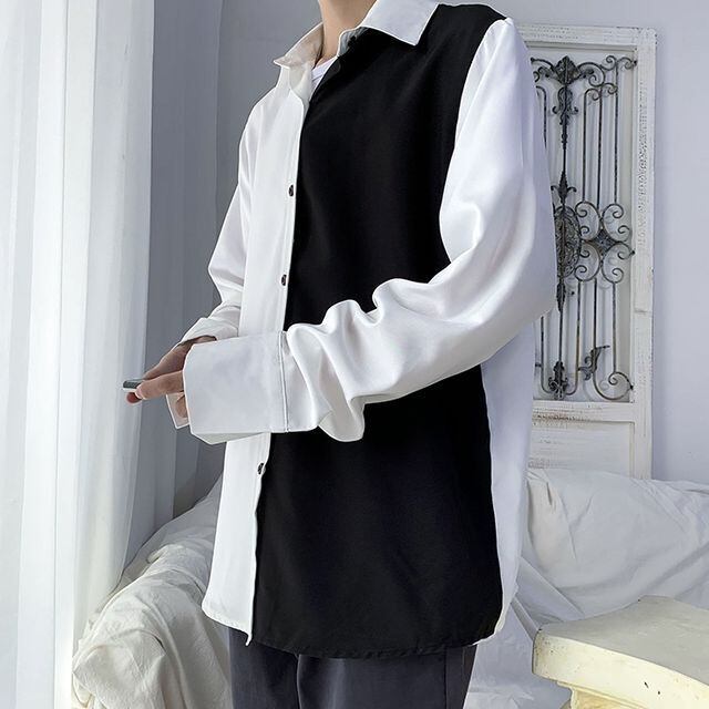 【予約販売】シャツ 長袖 メンズ バイカラー アシンメトリー ホワイト ブラック モノトーン シック こなれ感 お洒落 エレガント 韓国 トレンド 春 M/L/XL/2XL/3XL/4XL/5XL