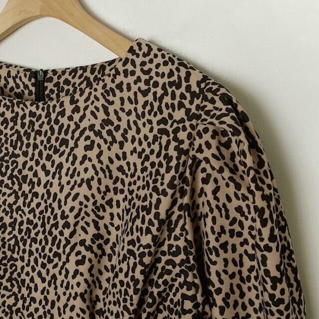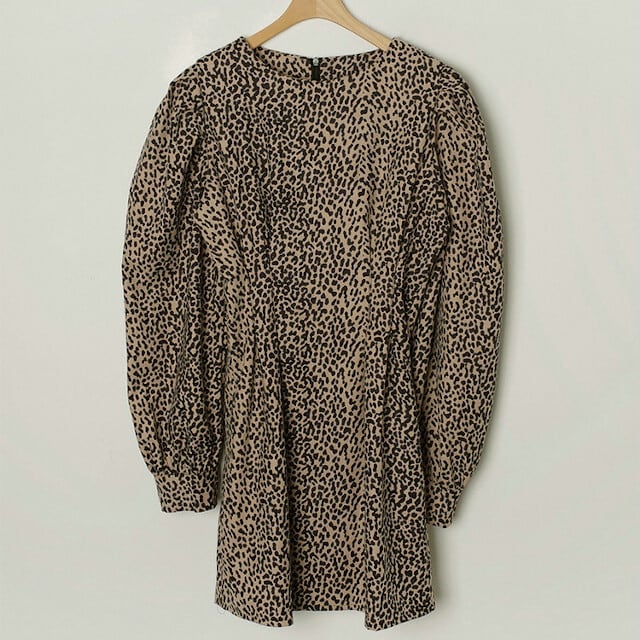 S/M レディース ワンピース パフスリーブ 長袖 レオパード ヒョウ柄 ミニ丈 ブラウン ラウンドネック 甘辛コーデ
