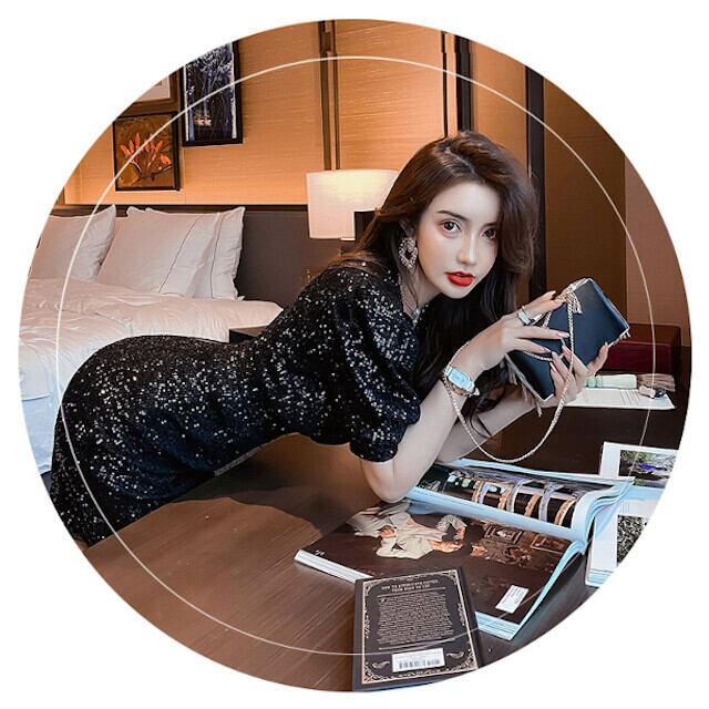 全2色 ブラック/ベージュ レディース タイトドレス スパンコール 光沢 パフスリーブ ボリュームスリーブ セクシー S/M/L/XL