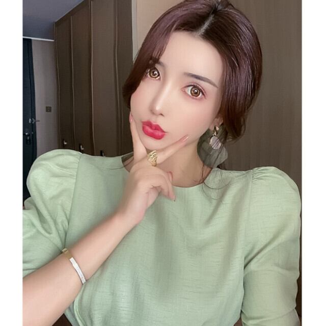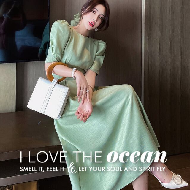 全2色 グリーン/ホワイト レディース ワンピースドレス パフスリーブ 半袖 フレアスカート Aライン ミモレ丈 ロング丈 S/M/L/XL