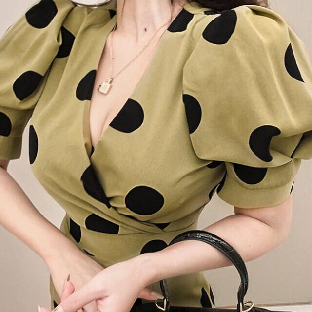 S/M/L/XL レディース ワンピースドレス オリーブグリーン ドット 水玉 カシュクール タイトスカート パフスリーブ ボリュームスリーブ