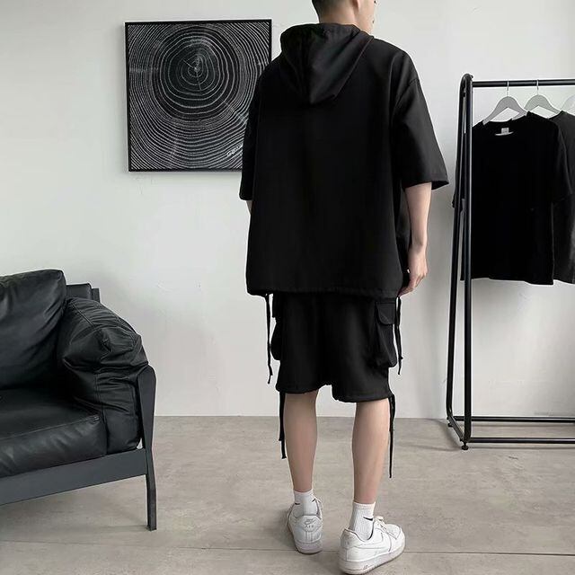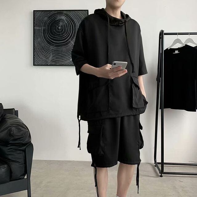 【予約販売】メンズ セットアップ 上下 ハーフパンツ パーカー 半袖 肩落ち ブラック カジュアル こなれ感 韓国 春夏 M/L/XL/2XL