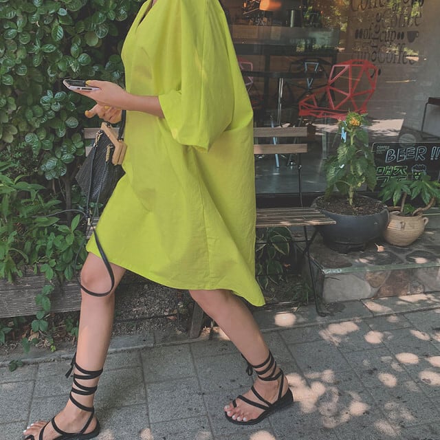 全3色 ライム/ベージュ/ブラック レディース ワンピース Vネック オーバーシルエット 半袖 ボリューム袖 Aライン ショート丈 膝上丈 S/M/L/XL