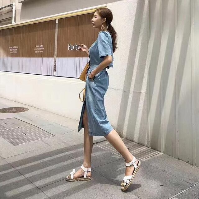 S/M/L/XL レディース デニムワンピース 半袖 ブルー スクエアネック 膝下丈 バックスリット 肌見せ