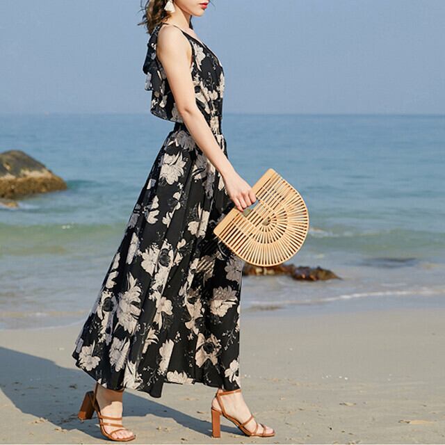 S/M/L/XL レディース マキシワンピース ワンピースドレス ホルターネック 背中あき フリル ノースリーブ フラワープリント 花柄 リゾート