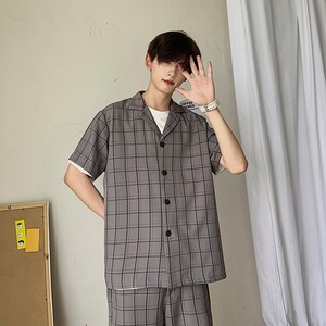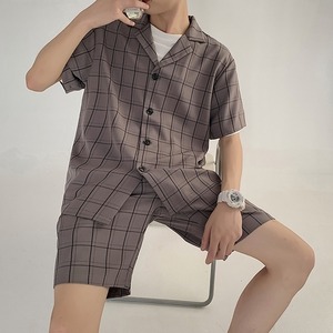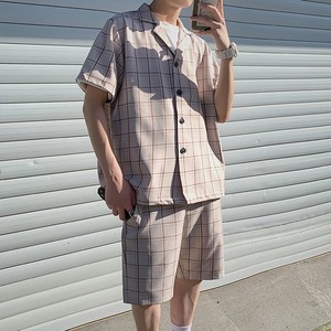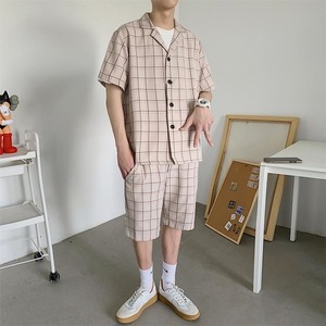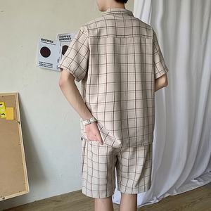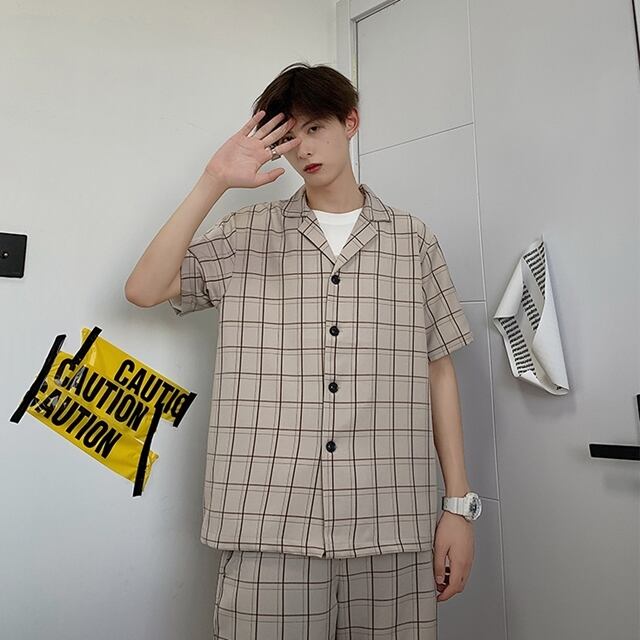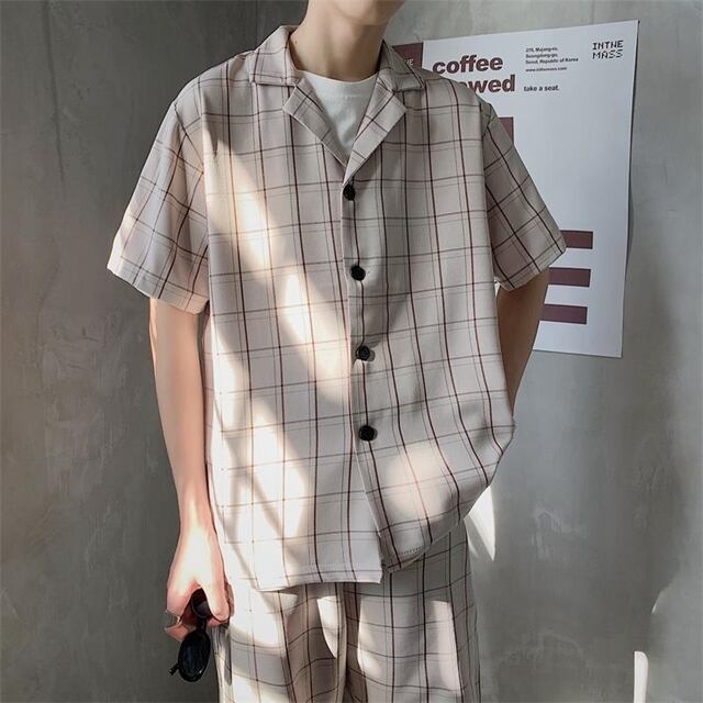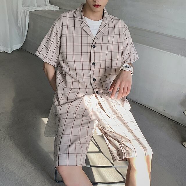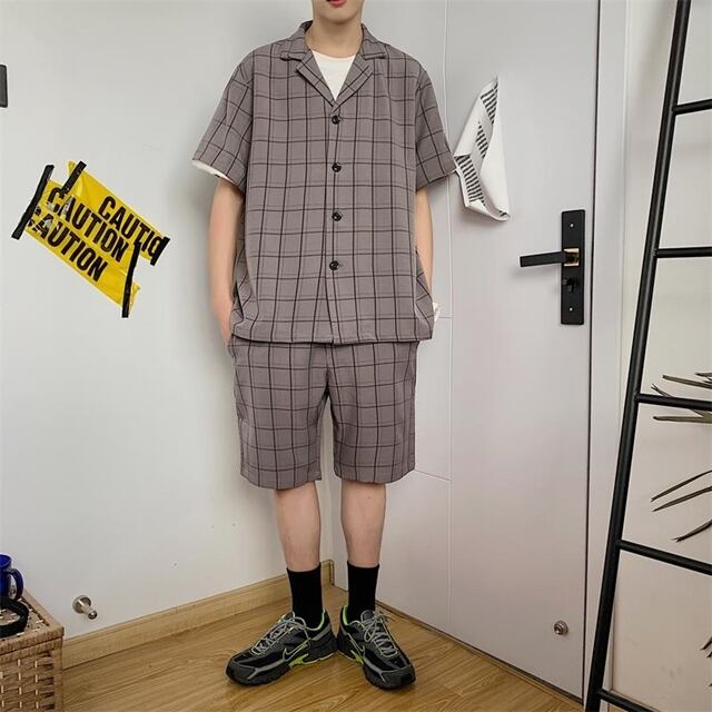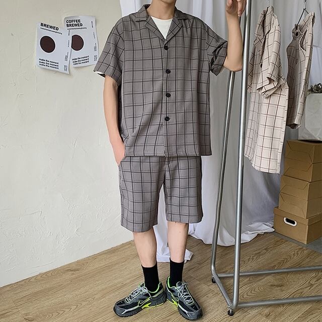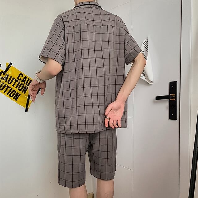 【予約販売】メンズ セットアップ 上下 ハーフパンツ 半袖シャツ チェック柄 グレー ベージュ カジュアル 春夏 M/L/XL/2XL