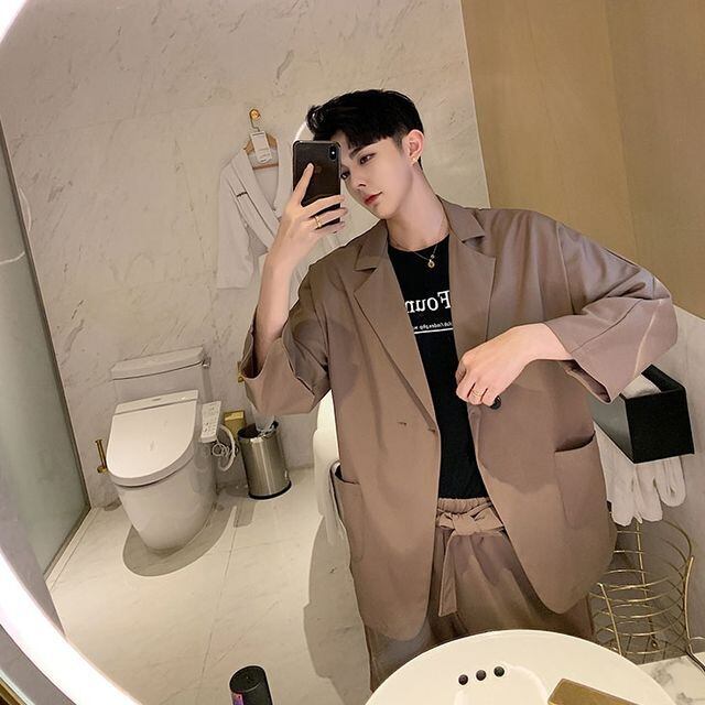 【予約販売】メンズ セットアップ 上下 ハーフパンツ シャツ 七分袖 無地 ブラック ベージュ カジュアル 春夏 M/L/XL/2XL