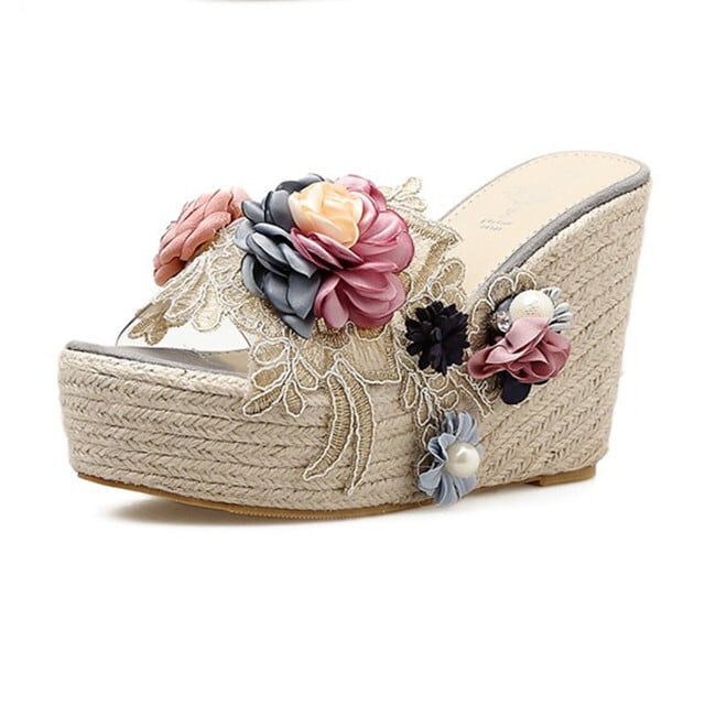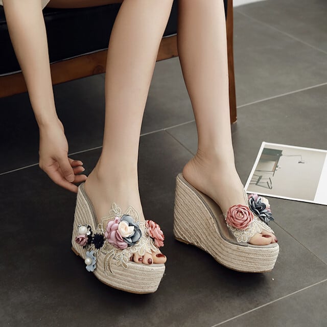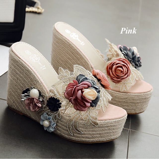 サンダル レディース レース フラワー ウエッジソール ピンク/ブラック/グレー/ベージュ 春夏 ガーリー 大人 ニュアンスカラー 22cm/22.5cm/23cm/23.5cm/24cm/24.5cm/25cm