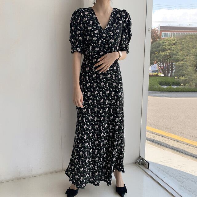 レディース ワンピース マキシ丈 ロングワンピ S/M パフスリーブ Vネック 小花柄 フラワー レースアップ ブラック/ブルー