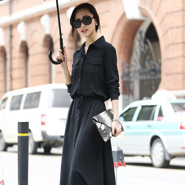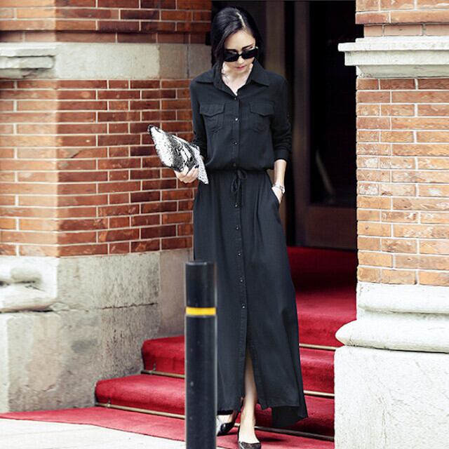 レディース ロングシャツ ワンピース とろみ シンプル マキシ丈 長袖 ブラック/ブルー S/M/L/XL/2XL