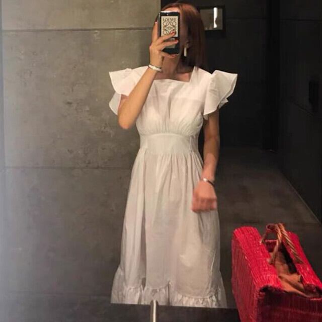 ワンピース レディース サマードレス ボヘミアン リゾート ビーチドレス ブラック/ホワイト リボン フリル襟 背中開き スクエアネック