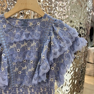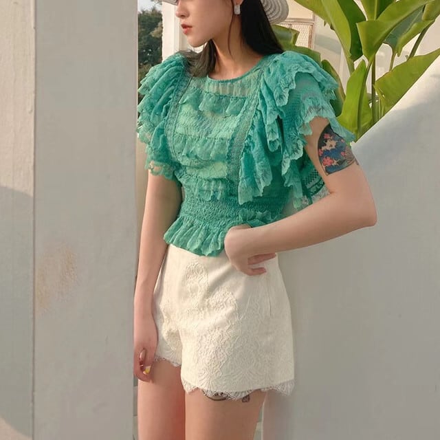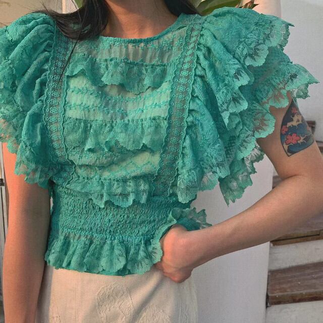 ブラウス レディース トップス レース フリル シースルー フラワーレース 透け感 全3色 ホワイト/ブルー/グリーン S/M/L 春夏