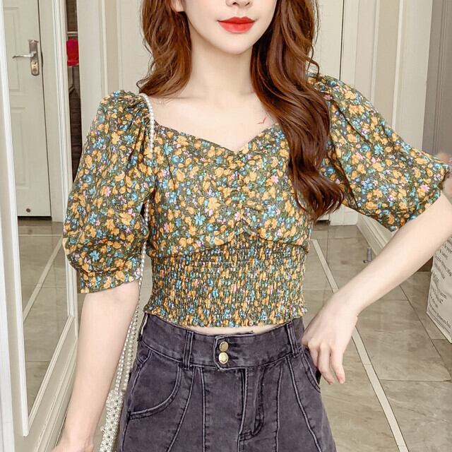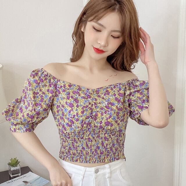 ブラウス レディース トップス 半袖 パフスリーブ 花柄 総柄 シャーリング かわいい ショート丈 全3色 イエロー/オレンジ/パープル S/M/L/XL