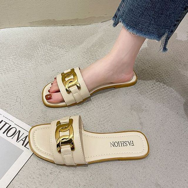サンダル レディース レザー ゴールドバックル ブラック/ホワイト ぺたんこ オープントゥ かっこいい おしゃれ 22cm/22.5cm/23cm/23.5cm/24cm/24.5cm