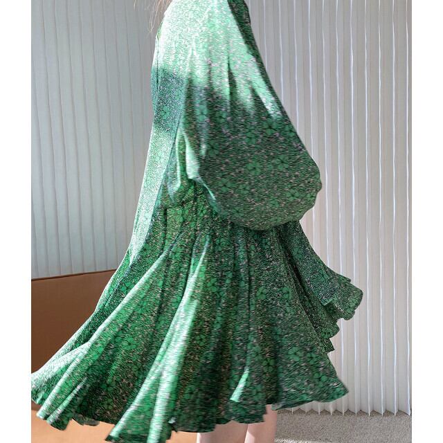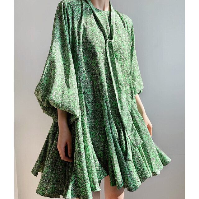 ワンピース レディース チュニック 花柄 フレア ボリューム袖 ボリュームスリーブ 長袖 ラウンドネック ウエストリボン リボンタイ ミニ丈 ミニワンピ S/M/L グリーン/ブルー/ブラック