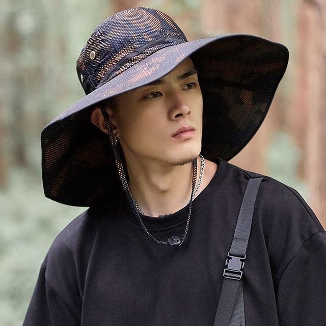 【予約販売】ハット メンズ レディース ツバ広 帽子 迷彩柄 ミリタリー アウトドア キャンプ Army 日焼け防止 UV対策 メッシュ ひも付き カーキ グレー ブラック ストリート スポーティー こなれ感 お洒落 韓国 トレンド