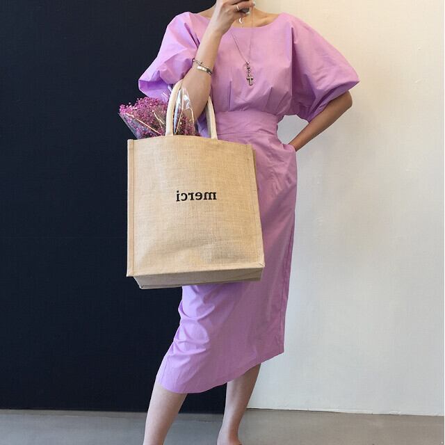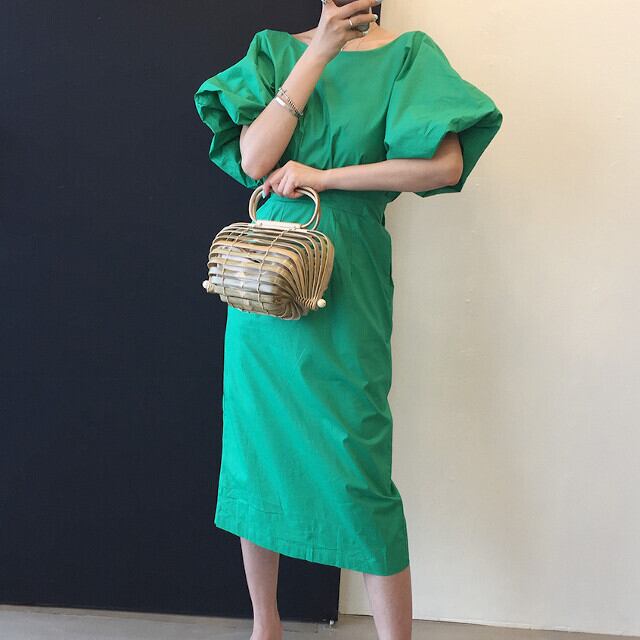 ワンピース レディース オープンバック 背中開き リボン 膝下丈 ボリューム袖 ランタンスリーブ グリーン/パープル M/L