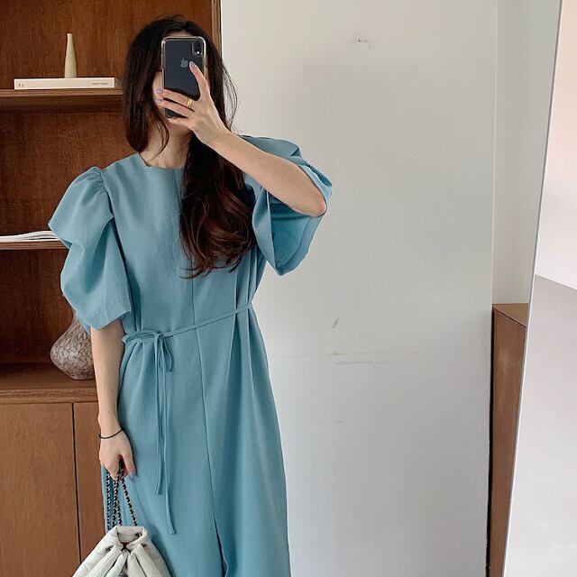 ワンピース レディース ロング丈 マキシワンピ パフスリーブ ボリューム袖 袖コンシャス ドレープ スリット オレンジ/ブルー/ブラック