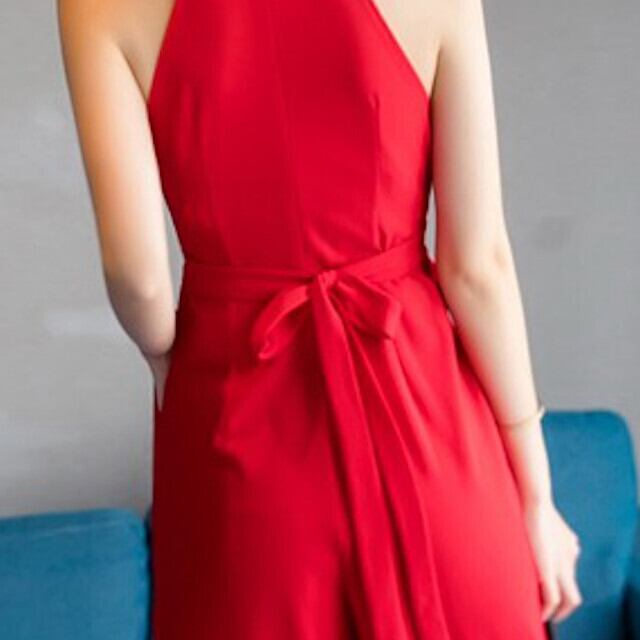 ジャンプスーツ レディース ホルターネック ウエストリボン ワイドパンツ ブラック/レッド S/M/L