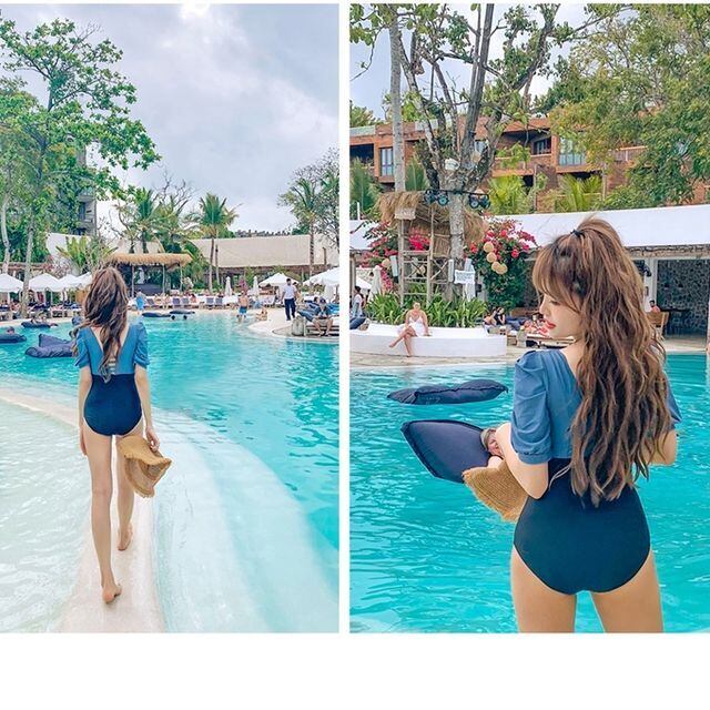 【予約販売】水着 レディース ワンピース バイカラー 編み上げ ブルー パフスリーブ 背中見せ フリル ビーチ リゾート スイムウェア こなれ感 お洒落 韓国 トレンドM/L/XL