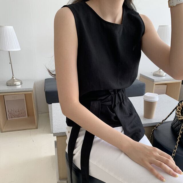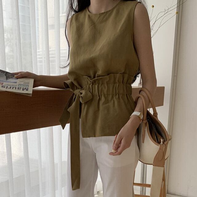 ブラウス レディース アシンメトリー ノースリーブ ウエストリボン シャーリング ラウンドネック ブラック/オーカー