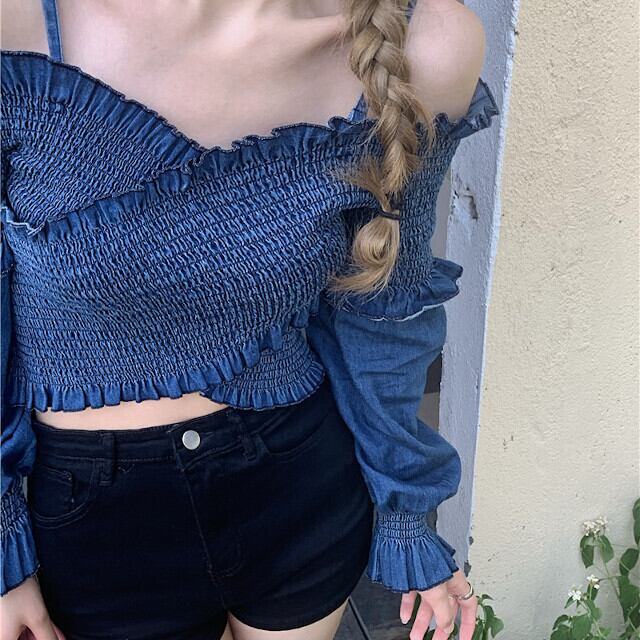 ブラウス レディース トップス オフショルダー クロスデザイン シャーリング 肌見せ デニム カジュアル おしゃれ