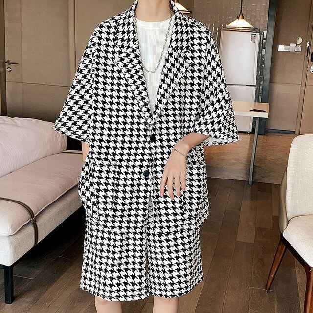 【予約販売】メンズ セットアップ 上下 ハーフパンツ 半袖 ジャケット 千鳥格子 総柄 ブラック スーツ フォーマル 結婚式 パーティー カジュアル 春夏秋 M/L/XL/2XL