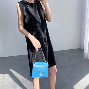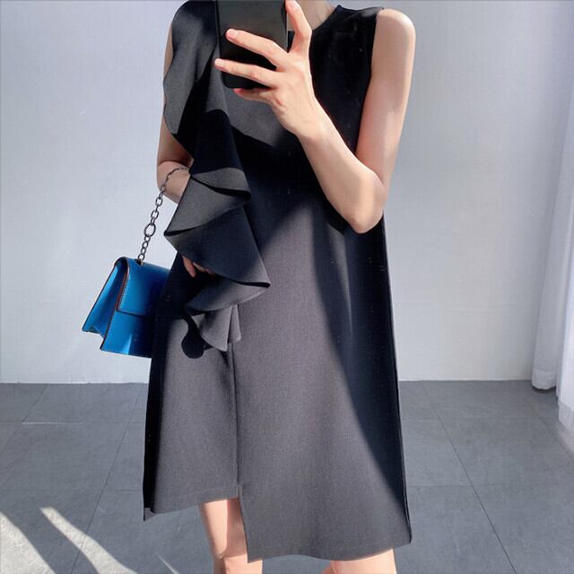 ワンピース レディース ワンピースドレス ラッフル フリル アシンメトリー 膝上丈 ミニ丈 ラウンドネック ノースリーブ ブラック S/M/L