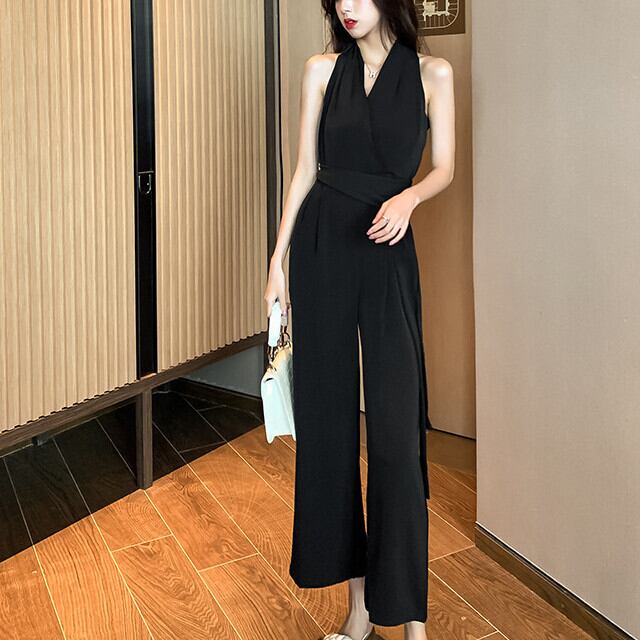 オールインワン レディース パンツスーツ カシュクール Vネック ワイドパンツ コンビネゾン サロペット ノースリーブ 全2色 ブラック/ホワイト S/M/L/XL