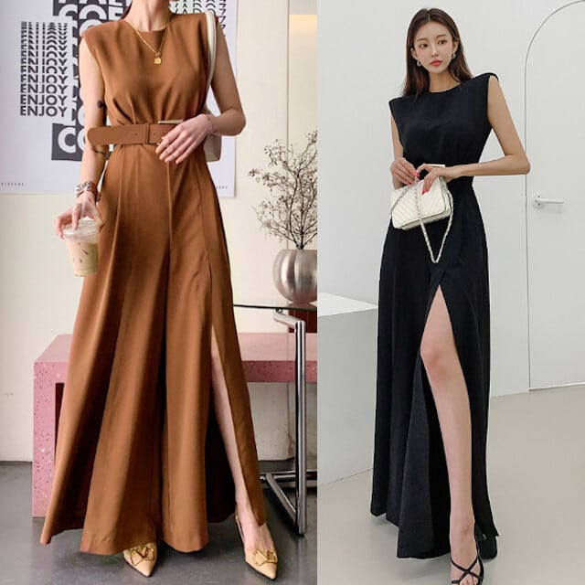 ジャンプスーツ レディース パンツスーツ ノースリーブ スリット ワイドパンツ ベルト付き 全2色 ブラック/ブラウン S/M/L/XL