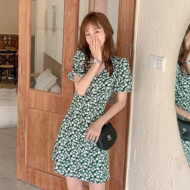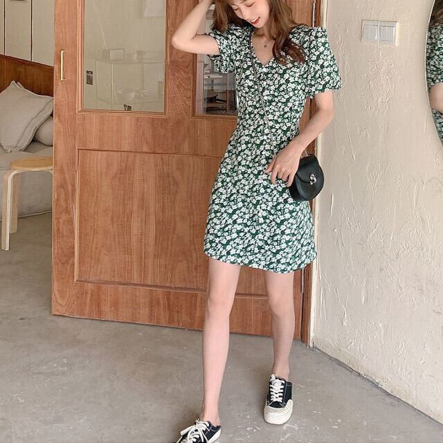 ミニワンピース レディース ミニ丈 花柄 グリーン フラワー かわいい Vネック フレアスリーブ S/M/L/XL/2XL/3XL/4XL