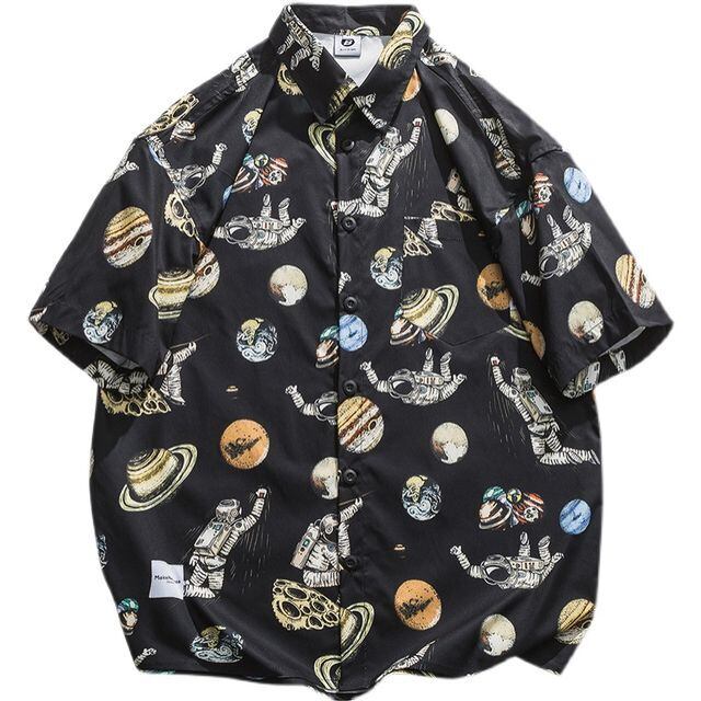 【予約販売】シャツ 半袖 メンズ 宇宙柄 総柄 スペース柄 アロハシャツ ブラック カジュアル シンプル こなれ感 お洒落 韓国 トレンド 春 M/L/XL/2XL