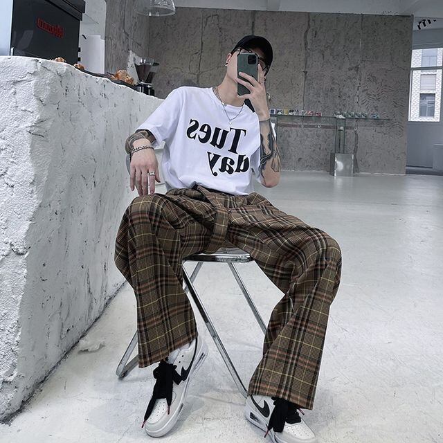 【予約販売】ワイドパンツ メンズ シンプル チェック柄 ワイドレッグ ボトムス きれいめ スタイリッシュ こなれ感 お洒落 韓国 トレンド 夏 秋 M/L/XL
