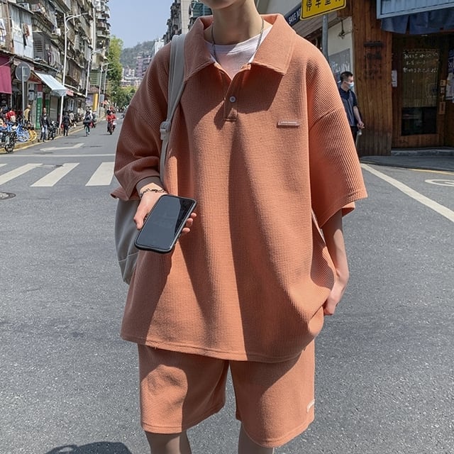 【予約販売】メンズ セットアップ 上下 半袖 ハーフパンツ ストリート ワッフル地 ブラック グレー ブラウン 部屋着 ジム スポーツウエア カジュアル 春 夏 大きいサイズ M/L/XL/2XL