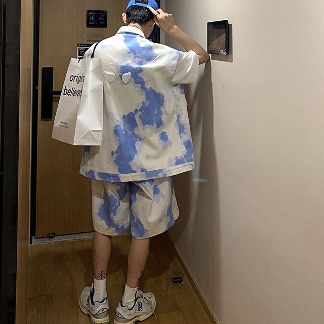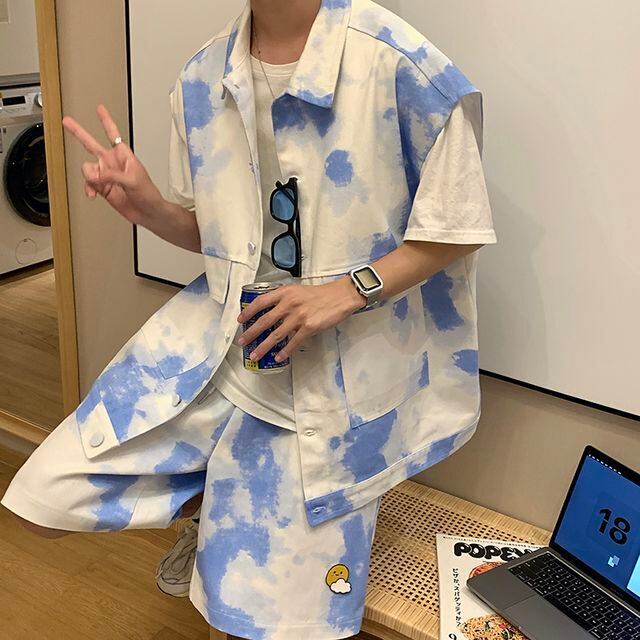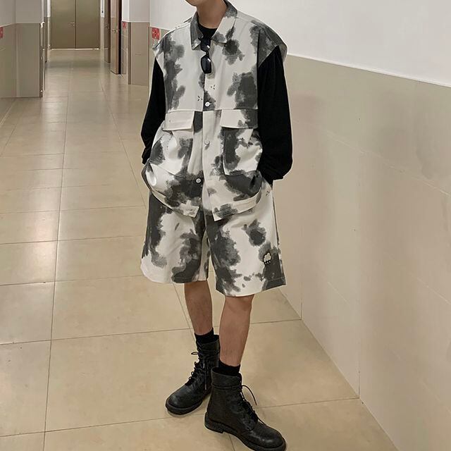 【予約販売】メンズ セットアップ 上下 ベスト ハーフパンツ ストリート タイダイ ブラック ブルー 部屋着 ジム スポーツウエア カジュアル 春 夏 大きいサイズ S/M/L/XL