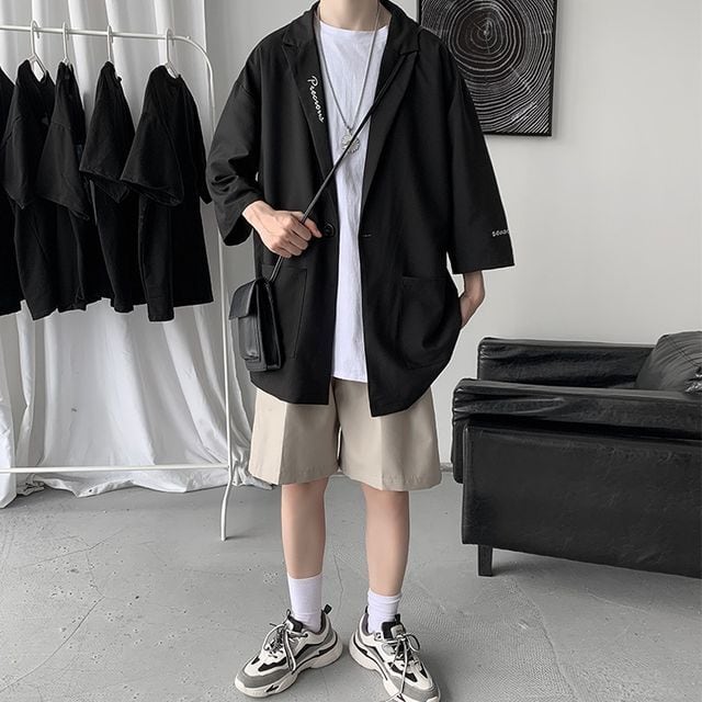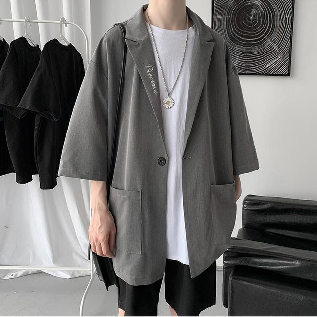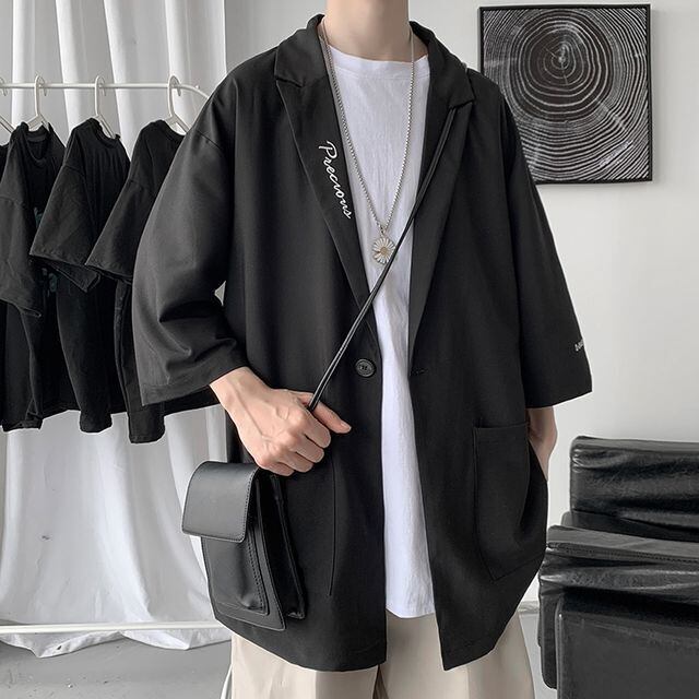 【予約販売】テーラードジャケット 七分袖 無地 アウター ジャケット メンズ 刺繍 ブラック グレー カジュアル こなれ感 お洒落 韓国トレンド 春 秋 大きいサイズ M/L/XL/2XL