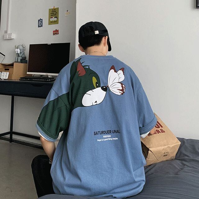 【予約販売】Tシャツ 半袖 メンズ 落ち肩 キャラクター 可愛い プリント ゆったり オーバーサイズ バックプリント グリーン ブルー ホワイ カジュアル シンプル こなれ感 お洒落 韓国 トレンド 春 夏 秋 M/L/XL/2XL/3XL