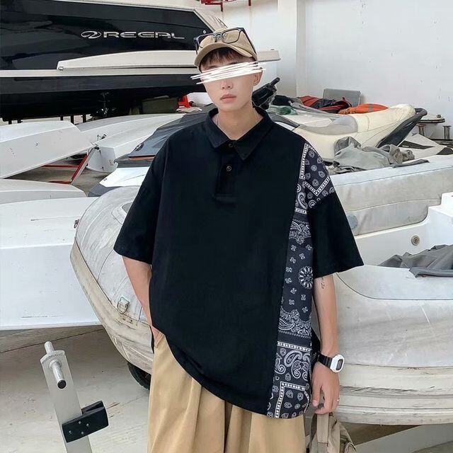 【予約販売】ポロシャツ 半袖 メンズ 落ち肩 ペイズリー柄 ゆったり オーバーサイズ シック モノトーン ブラック ホワイト M/L/XL/2XL
