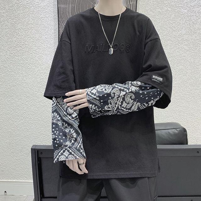 【予約販売】ロンT シャツ 長袖 メンズ 落ち肩 シンプル 袖柄 ペイズリー レイヤード 重ね着風 ゆったり オーバーサイズ グレー ホワイト ブラック ブルー カジュアル シンプル こなれ感 お洒落 韓国 トレンド 春 夏 秋 M/L/XL/2XL
