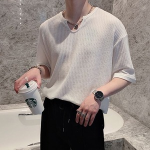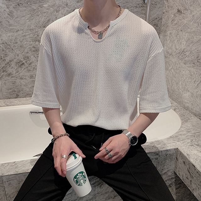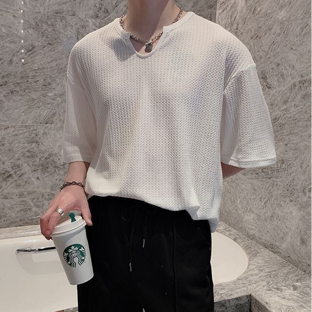 【予約販売】Tシャツ 半袖 メンズ 無地 ワッフル スリット ブラック ホワイト カジュアル シンプル こなれ感 お洒落 韓国 トレンド 春 夏 秋 M/L/XL/2XL