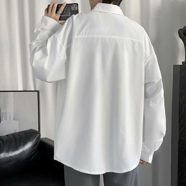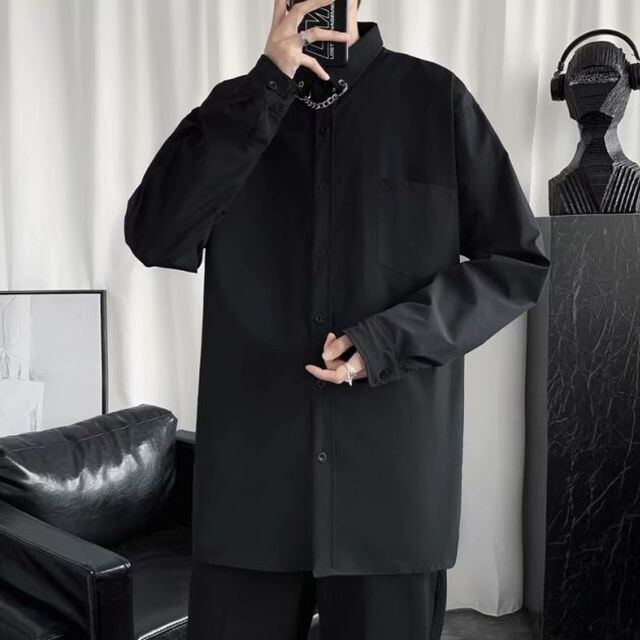 【予約販売】シャツ 長袖 メンズ オーバーサイズ 無地 襟チェーン ベージュ ブラック ホワイト モノトーン カジュアル シンプル こなれ感 お洒落 韓国 トレンド 春 夏 秋 M/L/XL/2XL