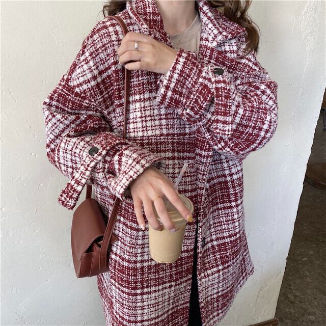 コート アウター レディース ミディ丈 チェック柄 かわいい おしゃれ レッド/ブラック S/M/L/XL