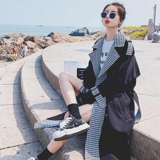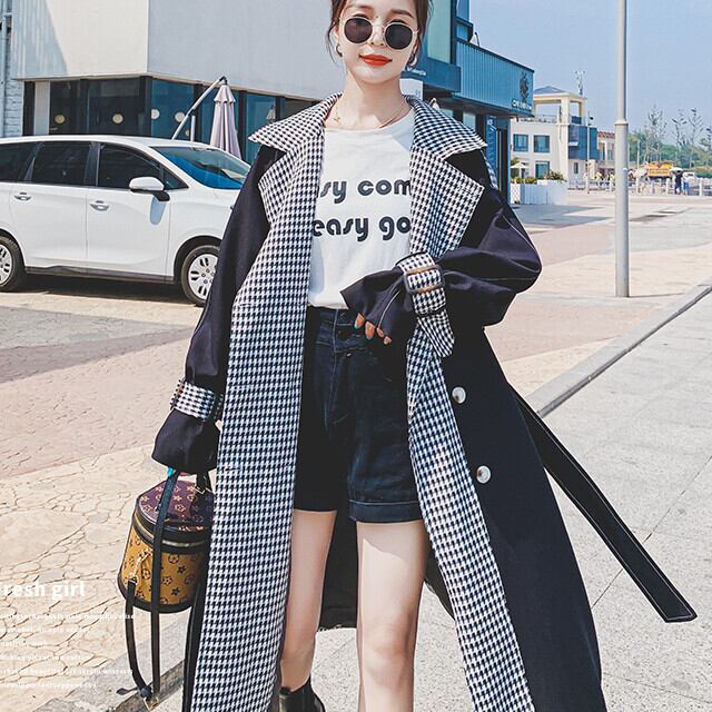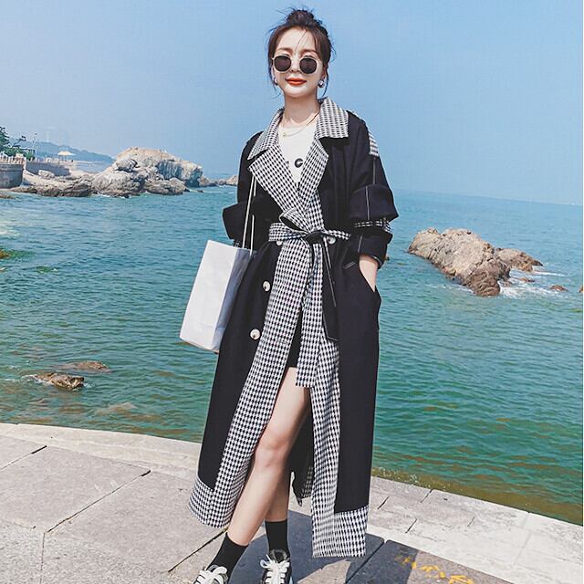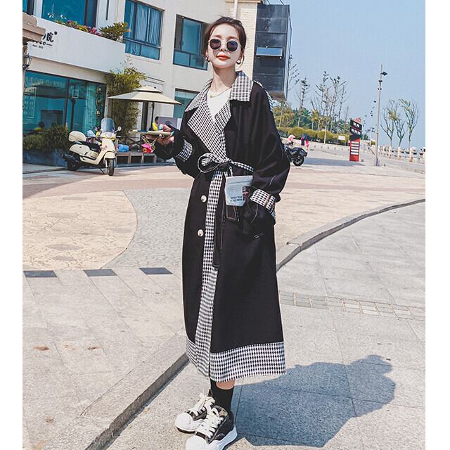 トレンチコート レディース アウター ロング丈 おしゃれ 配色 春秋冬 チェック ブラック S/M/L/XL